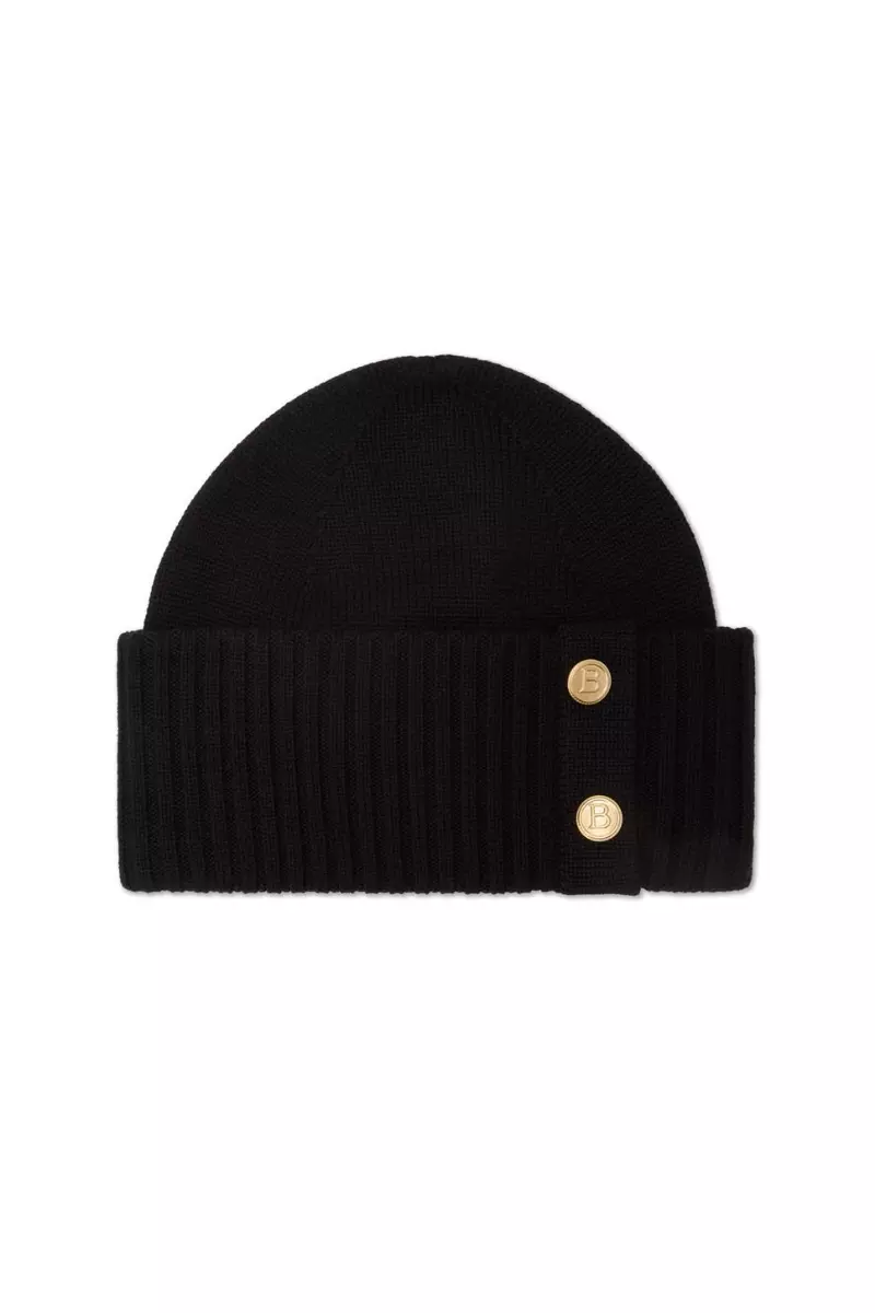 Roya Beanie er en ribbestrikket ulllue laget av myk merinoull. Nederdelen er brettet og detaljert med gullfargede B-knapper, perfekt for både varme og stil.