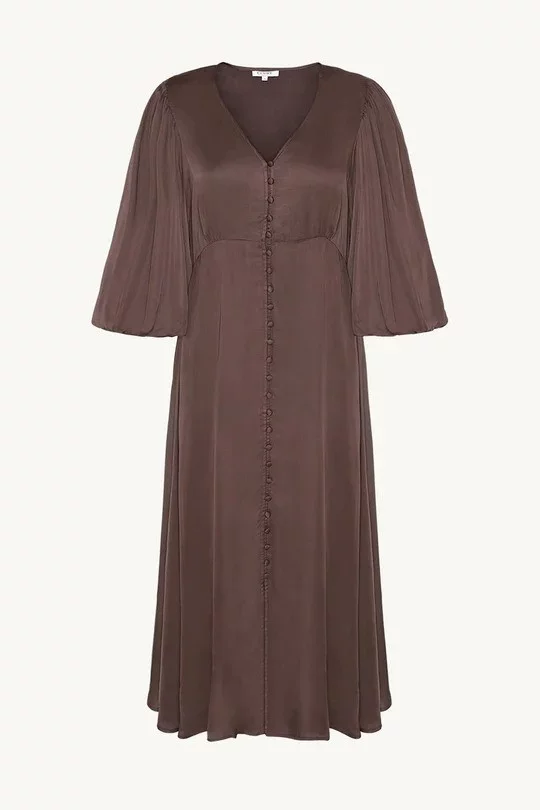 Maxikjole i 100 % viskose med mykt fôr for komfort. Designet med en flatterende V-hals, stofftrukket knappelukking foran og voluminøse 3/4-ermer. Det flagrende skjørtet og den lett rynkede midjen skaper en feminin silhuett, noe som gjør den til et perfekt valg for både spesielle anledninger og elegant hverdagsstil.