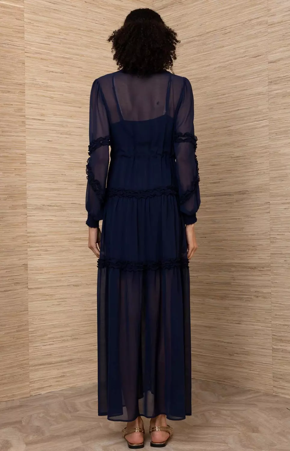 Meghan kjolen fra Hale Bob er laget i en deilig og tynn vasket chiffon. Kjolen har en høy, smocket hals med en delikat v-hals, lange ermer med elastiske mansjetter, knappestolpe, som gjør at du kan tilpasse utringningen i halsen, samt splitten i front, og knyting for en feminin silhuett.