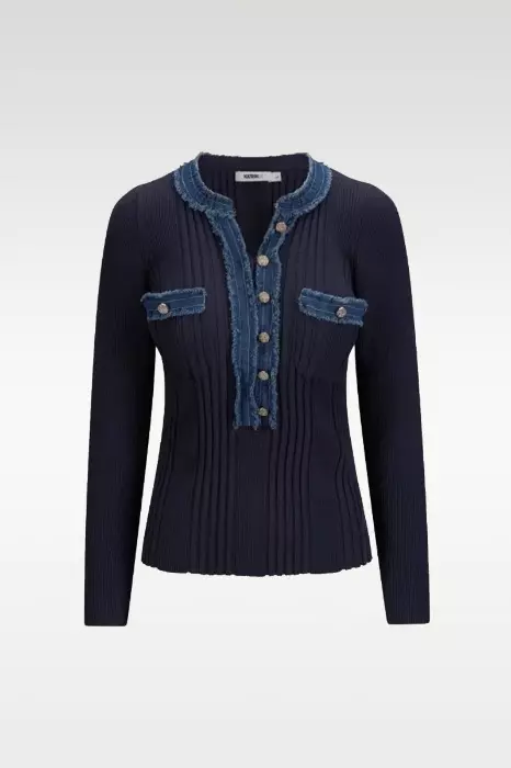 Den råeste genseren fra norske Katrin Uri. Her får du den ultimate genseren med lange ermer og jeans detaljer og gullknapper. Den er supermyk og ribbestrikket. Rund hals og råkant.