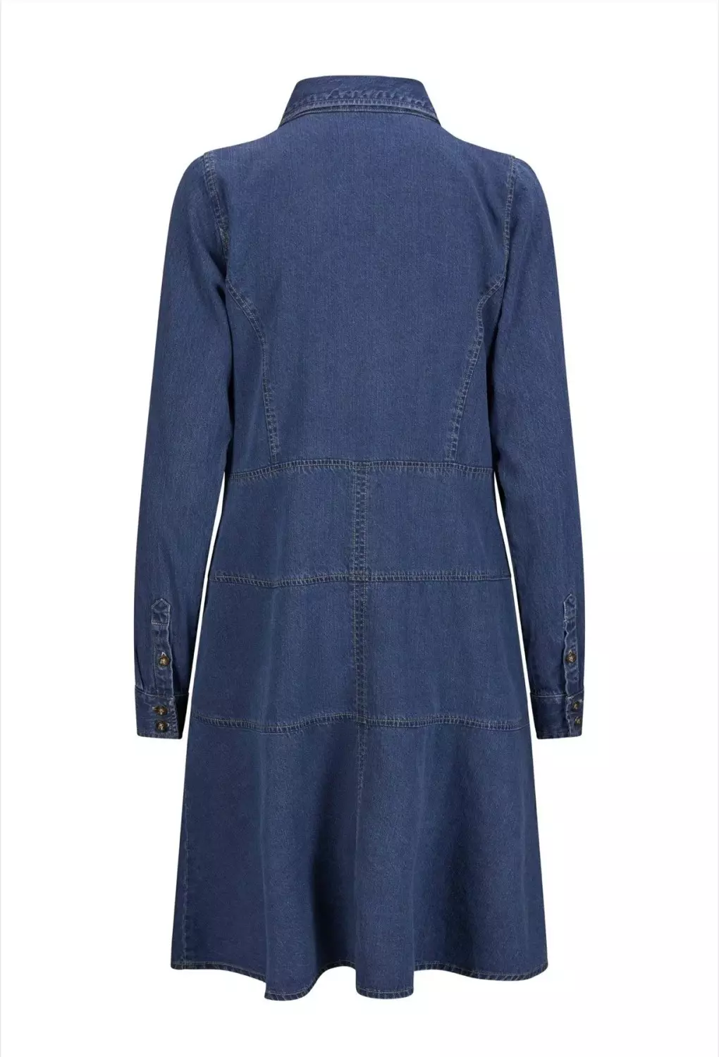 Jeans kjole fra Katrin Uri med lange armer. Den har vanlig skjortekrage og knapper hele veien ned. Kjolen går til kne.