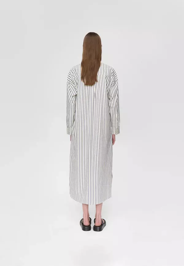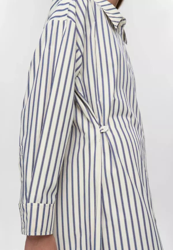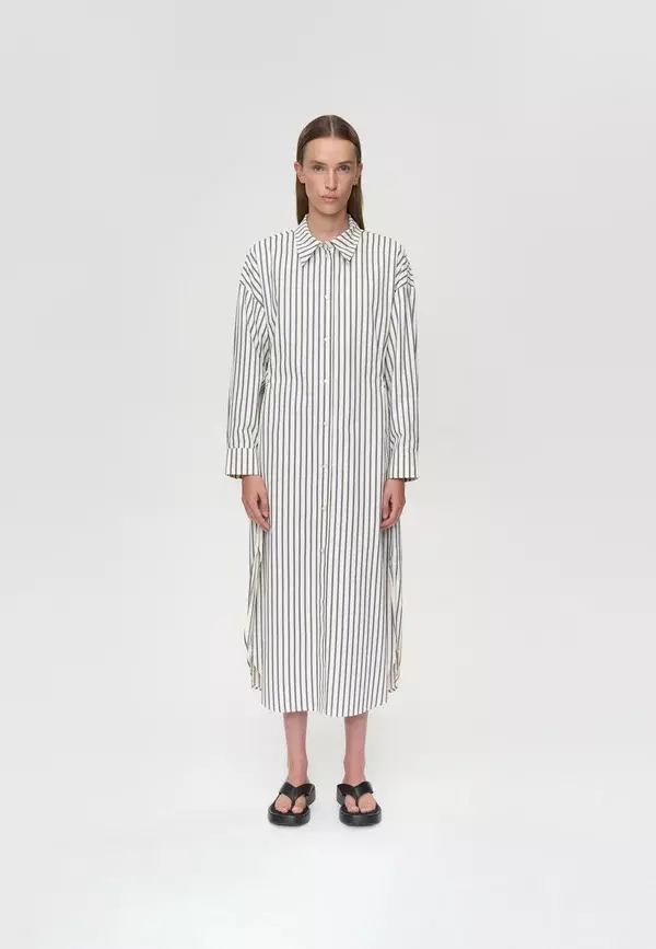 Løs skjortekjole i en klassisk stripete bomullsblanding. Justerbar midjedetalj gir et feminint og moderne preg til et klassisk garderobe-essensielt plagg.