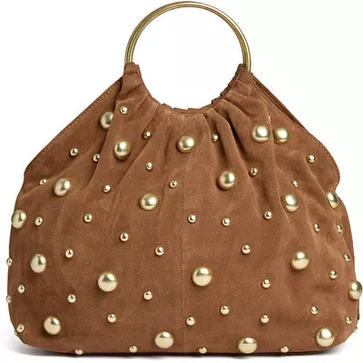 This handbag combines exclusive elegance with a modern, edgy twist. Crafted from the softest 100% suede, it exudes luxury and sophistication, while the decorative mix of large and small rounded studs on the front adds an eye-catching, bold touch. The two large metal rings serving as handles create a striking feminine statement – a perfect balance of luxury and coolness.
