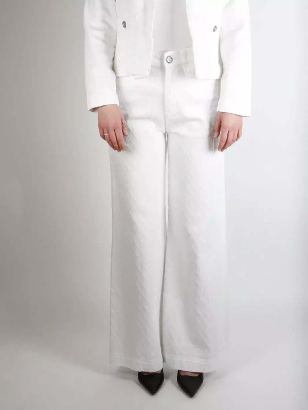 Filly Jeans Pin Diamond fra Shaft. En lekker hvit jeans med diskret mønster. Jeans med med høy midje og og utsvingte ben.