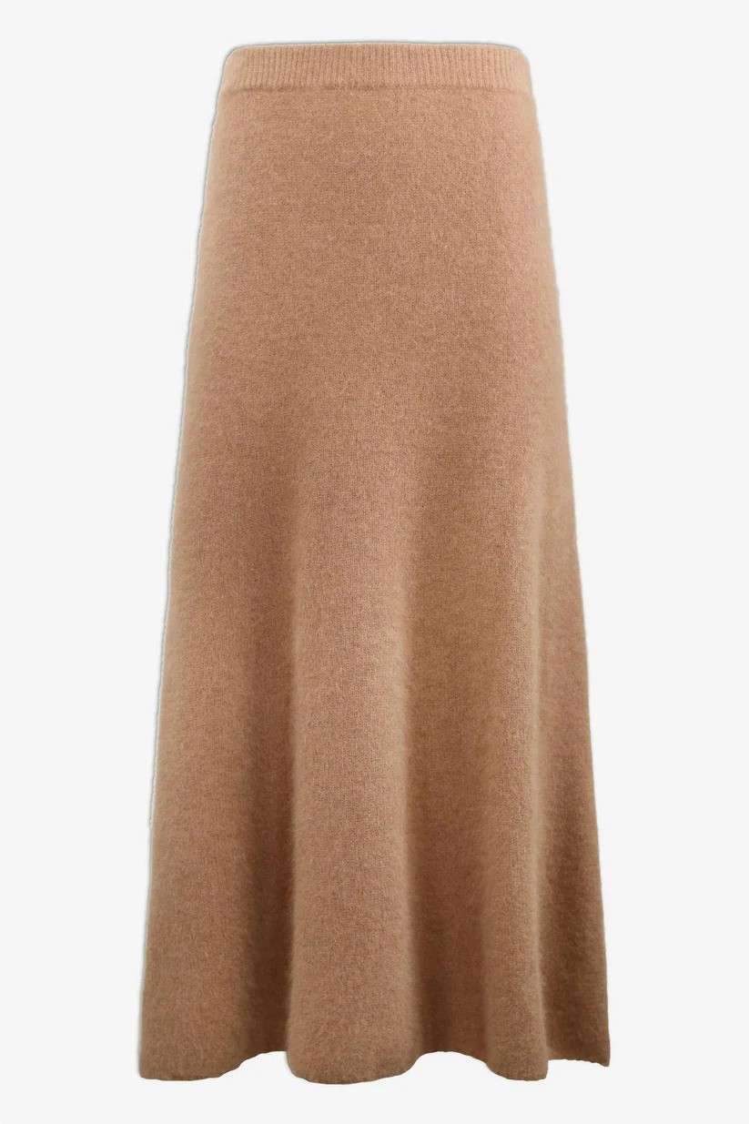 Maxiskjørt i A-form. Den har ribbestrikk i midjen med strikk på innsiden, og en delikat finish nederst. Skjørtet er laget i vaskebjørnpels som er et mykt og lett materiale med gode isolerende egenskaper, som holder deg varm i kaldt vær.