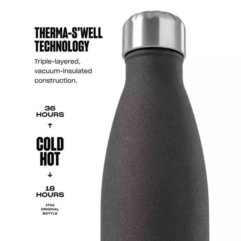 Desert Sky fra S´well. Hold kroppen i væskebalanse med de flotte flaskene i dobbelt lag med stål fra S´well. Flaskene holder på kalde drikker i 24 timer og varme drikker i 12 timer. Flaskene har en stor åpning som gjøre dem lett å fylle med både vann og isbiter samt rengjøring.